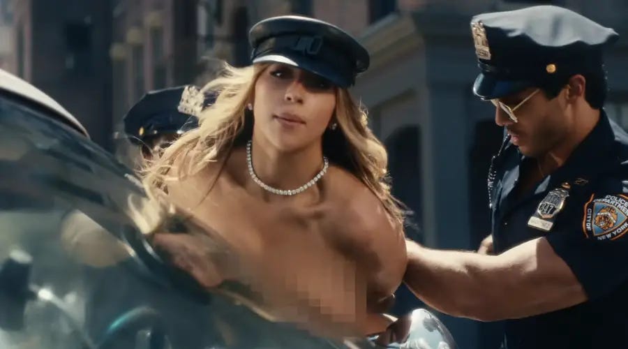 This shouldn’t have been a surprise, maybe, but she was stunning. She was also seemingly naked. I was shocked, and strangely concerned about how this girl was being seen. She was strutting around a fake New York City, with one of the first shots of her comeback music video being of her partially naked ass. Then, she’s depicted as fully naked, being pushed onto a car and handcuffed by the cops. She has a mischievous and playful smile on her face, enjoying being pushed around. There was something off about the whole thing in a very unsettling way.