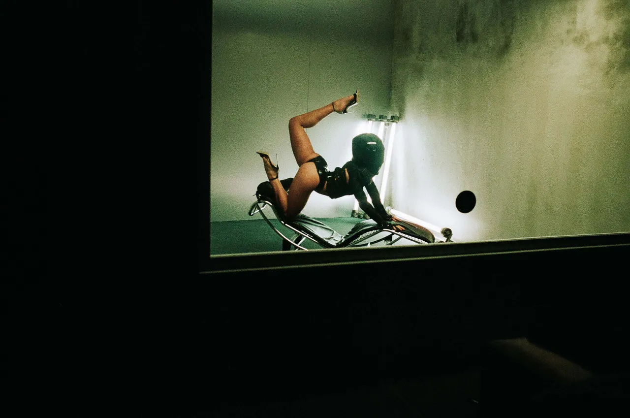 Unlike her other videos, there isn’t much formal choreography; rather, she’s putting on a show for a viewer with no face, later revealed to be herself. She’s seen through the glass wall, with the intercom almost always in frame.